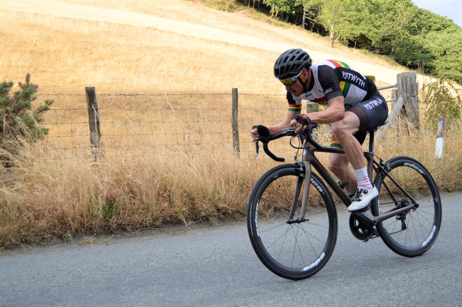 In perfect conditions, riding a specialist hill climb bike, pro rider Gruff Lewis took the win in an astonishing 4 minutes. Second place and very close to taking the top spot, went to new Ystwyth CC club member Chris McLean in a very fast time of 4min and 10sec and third place to up and coming rider Owen Evans in a time of 4min and 25sec. In past events, all three of these times would have taken the win.